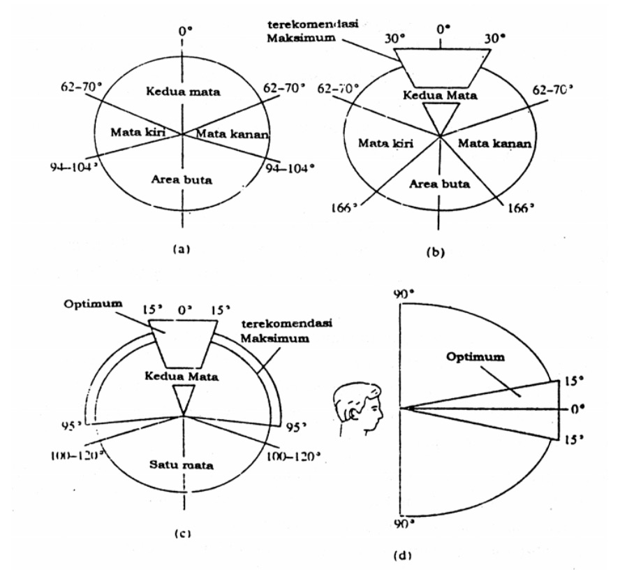 Gambar (c) menunjukkan daerah penglihatan ketika kepala dan mata diperbolehkan untuk bergerak. Pada keadaan ini medan penglihatan maksimum adalah ± 95º tetapi untuk pekerjaan yang bersifat interaktif besarnya medan penglihatan optimum adalah ± 15º.