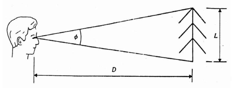 Gambar diatas menunjukkan sebuah objek yang mempunyai tinggi L dan jarak dari mata pengamat adalah D. Sudut penglihatan yang dibentuk :