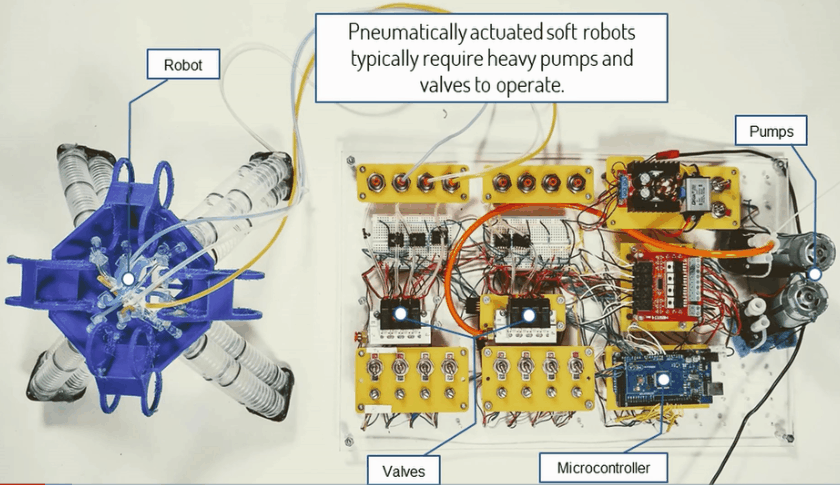 Seperti yang ditunjukkan pada gambar di bawah, banyak robot dikendalikan oleh komponen elektromekanis. Seperti katup dan pompa, yang biasanya berukuran besar dan mahal.